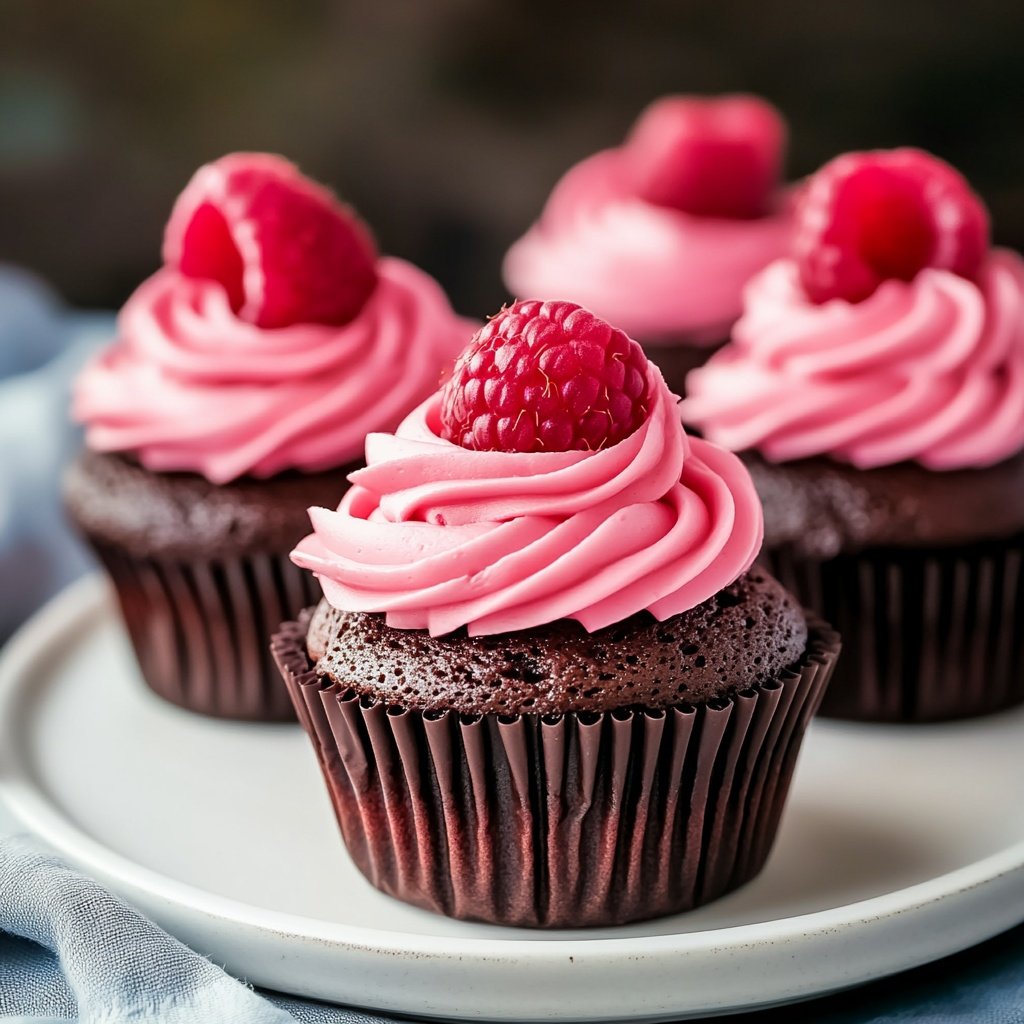 Dark chocolate cupcakes with raspberry buttercream frosting deliver a luxurious blend of deep cocoa richness and bright berry tang.